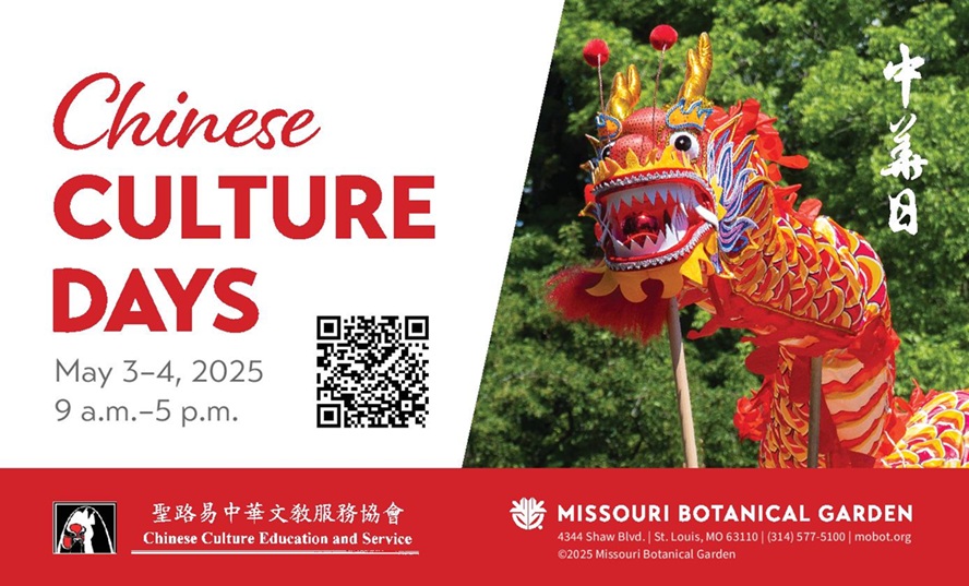2025年中华日(Chinese Culture Days)将于5月3日至4日,在密苏里植物园隆重举行。每天上午9点至下午5点,带您沉浸式体验丰富多彩的中华传统与现代文化!