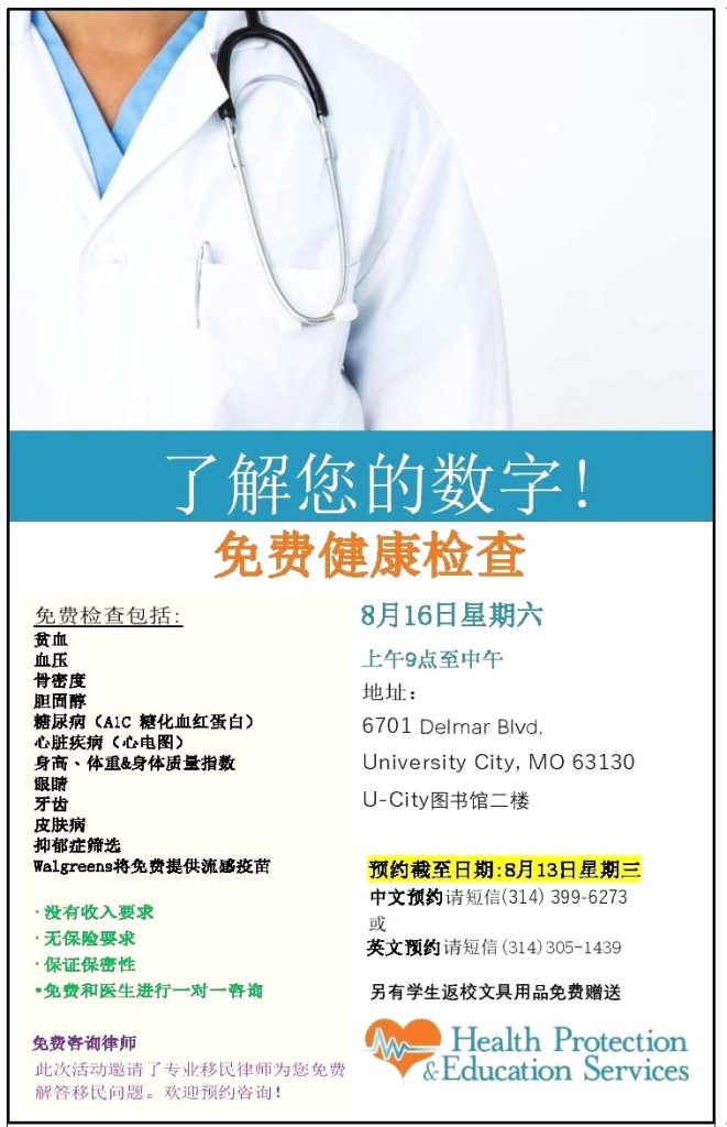 预约截至日期: 8月13日(星期三): 中文预约请短信(314) 399-6273 或 英文预约请短信(314)305-1439