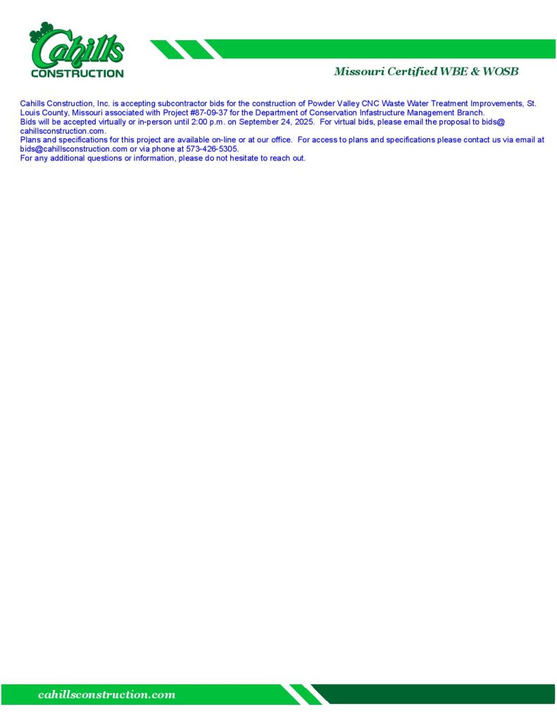 Cahills Construction, Inc. is accepting subcontractor bids for the construction of Powder Valley CNC Waste Water Treatment Improvements, St. Louis County, Missouri associated with Project #87-09-37 for the Department of Conservation Infrastructure Management Branch.