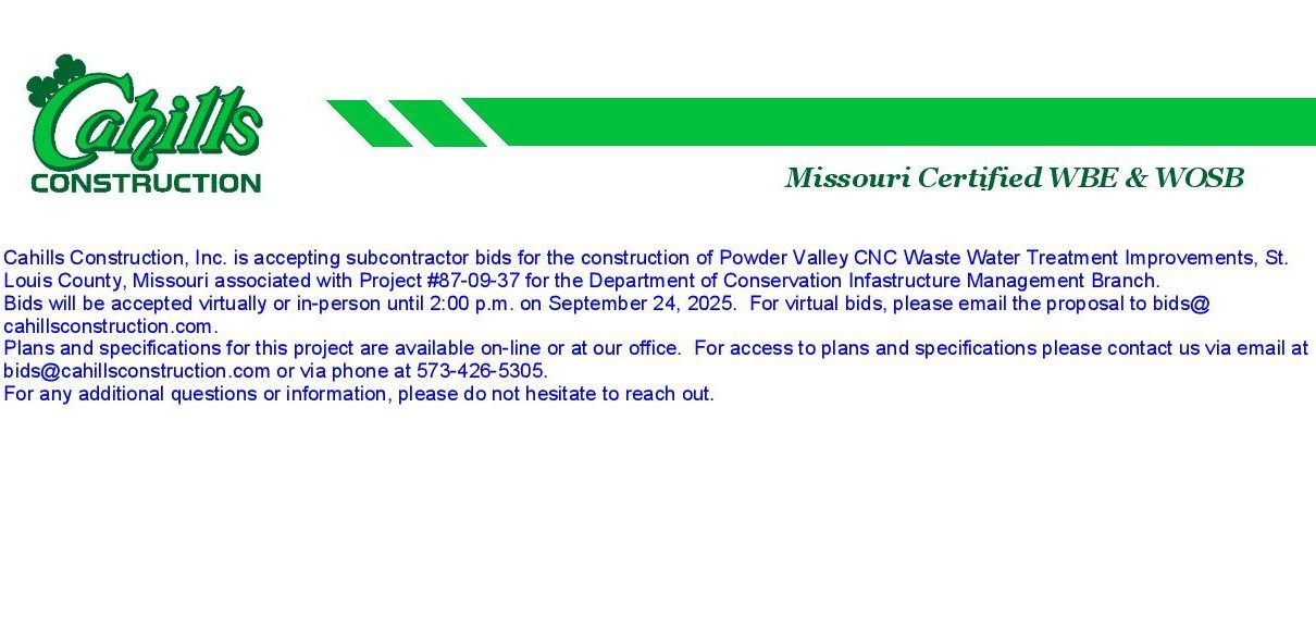 Cahills Construction, Inc. is accepting subcontractor bids for the construction of Powder Valley CNC Waste Water Treatment Improvements, St. Louis County, Missouri associated with Project #87-09-37 for the Department of Conservation Infrastructure Management Branch.