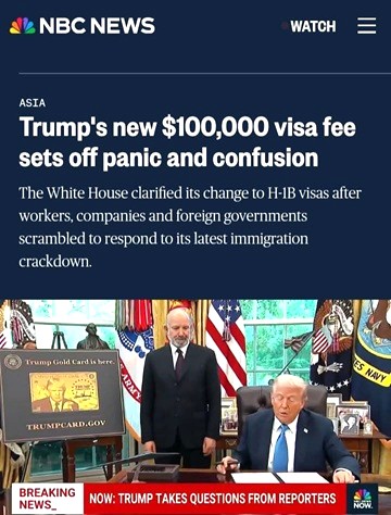 【圣路易时报讯】美国总统唐纳德·特朗普9月19日签署新政策,对“高技能外籍科技工作者”(H-1B签证申请者)征收高达10万美元的一次性费用。消息一出,立即引发科技人才、公司与移民家庭的广泛关注和强烈反应。