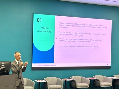 來自邁阿密癌症研究中心的莫遵立博士,則分享針灸目前在西方醫學上的使用。他所服務的癌症醫院使用針灸作為整合醫學的一環,幫助病人有效改善化療引起的噁心與嘔吐 以及癌症引起的疼痛 、減輕癌症治療期間的不良反應,並提升癌症患者的生活品質。他在會中介紹針灸的原理以及不同類型的針的作用,並以人體圖解的方式,幫助大家了解針灸在人體穴位上的使用,例如人耳朵上的穴位,就和全身其他器官包括手腳相通,而腳底穴位也和內臟器官相連。針灸除了緩解疼痛之外,一些研究也發現針灸有助於病人調節生理功能,並促進身體自我修復,對疲勞、熱潮紅、神經病變、焦慮及失眠等方面頗有成效。更有新興的研究指出,針灸可能增強免疫功能,並維持情緒健康。
