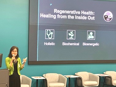 另外一位遠從印弟安那州赴會主講的邱佩玲女士,目前從事再生健康教練與諮詢,持有再生健康從業人員、臨床虹膜學家、認證整合營養健康教練、生物能量健康從業人員等多項證照。她分享因為幼年白血病過世的女兒的經歷,讓她開始踏上探索恢復身體內在環境健康的學習和職涯,如今成為幫助別人改善慢性疾病 減重、失眠等問題的專業人員。她強調人體本身天生就有自我修復能力,但受到後天環境影響而導致體內失衡,所以再生健康就是先從維持體內酸鹼平衡,利用補充品幫助身體進行排毒,讓細胞潔淨後更有效的吸收養分,並且修復腸道,激活細胞,讓全身恢復溝通。她也在會中分享不少實例,透過再生健康療法為糖尿病、憂鬱症、肥胖、皮膚病 、食物過敏等患者,改善了多年的健康問題。