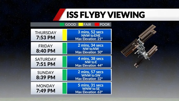 根据报道,从周四到下周一(9月25日至29日),ISS 将一共出现五次,观测时间与方向如下(时间均为当地时间):