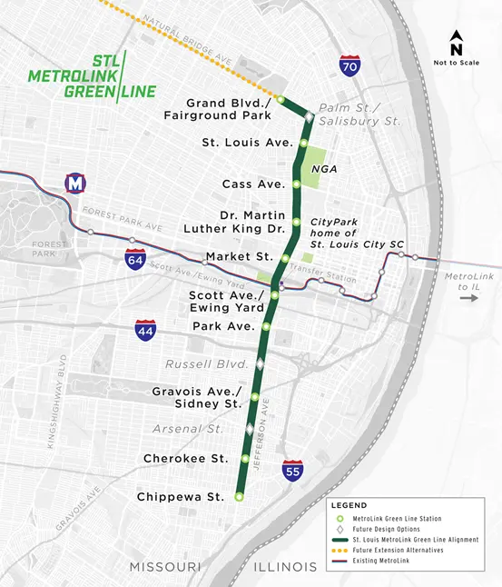 圣路易斯市政府表示,由于高达11亿美元造价以及难以获得联邦资金,取消执行MetroLink绿线轻轨南北走廊扩展计划。原绿线设计全长约5.6英里(约9公里),设有10个车站,从市中心延伸至Midtown、多所学校及Fairground Park,并与东西向MetroLink线在Scott Ave交汇。本案已投入两年设计和环境评估工作并举办过社区公听会,曾被视为促进就业、教育和医疗交通可达性、完善城市南北平衡的重要工程。市府表示绿线每日预计仅服务5000人,单人造价在全球同类项目中居高,轨道工程成本、地下管线迁移和征地让总预算超过项目可承受范围。