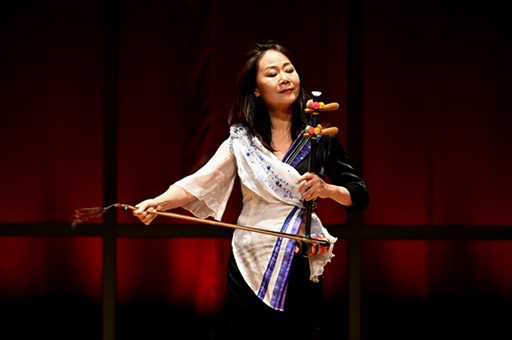 当晚收获了“意外而珍贵”经历的,当属UMSL音乐专业的美国学生Daniel。三天前云南艺术学院代表团到UMSL音乐系访问交流时,Daniel就成了尹毅老师的粉丝。而在那之前,他只能在网上自学拉二胡。演出当晚,Daniel带着自己的二胡直奔后台找尹毅老师。为了学习拉二胡,这美国大孩子也是拼了。谁能拒绝如此酷爱传统中国乐器和音乐的美国学生呢!于是乎尹毅老师抓紧时间耐心教导Daniel近一小时。从师徒二人合奏《牧羊姑娘》的视频来看,教学成果令人惊艳。