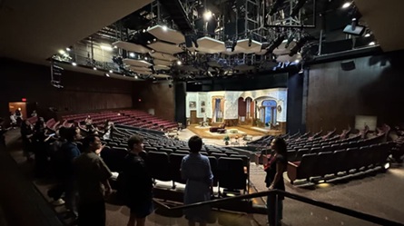 访问团如期而至。同行相见,分外亲切。赵老师带领一行人参观了设施完善、配置一流的剧场,并介绍艺术学院旗下与之相关的表演艺术和剧院节目(专业排名全美前25%)。这座剧场也是舞蹈系学生年度大放异彩的舞台。