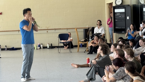 云艺音乐学院院长林林代表访问团,对韦伯斯特大学舞蹈系的热情接待表示感谢。访问团成员逐一自我介绍后,林院长简要介绍了云艺的历史、学科建设、发展历程及国际交流项目,并诚挚表达了与韦伯斯特大学艺术学院开展交流合作的意愿。学生们闻之雀跃,现场气氛热烈。全程由赵玺老师同声传译,沟通顺畅无碍。