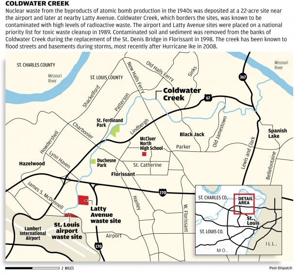 从1940年代起,这些废料多数是露天堆放,没有防护措施。风吹雨淋后,放射性污染物(镭、铀、钍及衰变产物)进入了地下水与附近水道。冷水溪(Coldwater Creek)正好从机场北侧流过,逐渐成为放射性物质扩散的重要途径。