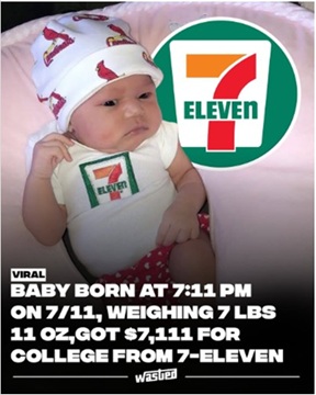 【圣路易时报讯】在许多华人文化中,孩子的出生时辰被视为命运与好运的象征。而在美国密苏里州,一名女婴于 2025 年 7 月 11 日(也就是 7-Eleven 的品牌纪念日)晚上 7 点 11 分诞生,体重正好 7 磅 11 盎司——一连串完美呼应 7-Eleven 数字的“天选时刻”,引发全美媒体热议。