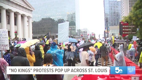 2025年10月18日,「不要国王」(No Kings)抗议活动在全美掀起空前浪潮,数百万人走上街头反对特朗普政府的独裁倾向及威权政策。圣路易斯地区同样不例外,尽管遭遇连日暴雨,从圣路易斯市中心基纳广场(Kiener Plaza)到塔姆大道(Tamm Avenue)及郊区圣查尔斯郡、富兰克林郡和杰佛逊郡等地,都聚集了大量抗议群众。抗议者身穿雨衣、披着斗篷,手持标语牌,高喊捍卫民主与宪法、反对独裁政府的口号,坚决表达对民主倒退的忧虑与反抗。