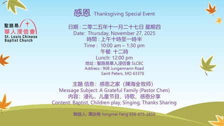 11月17日星期四10:00am-1:30pm 聖路易華人浸信會將舉辦感恩節聚會。內容包括:感恩敬拜,信息分享,感恩見證,兒童節目和浸禮。歡迎各家自帶一菜分享對主耶穌基督的感恩。“要常常喜樂,不住地禱告, 凡事謝恩;因為這是 神在基督耶穌里向你們所定的旨意。 ”(帖撒羅尼迦前書5:16-18)