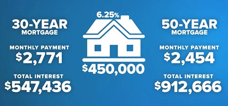 若以同样利率假设进行 50 年期计算(实际若推行可能利率更高,这里按等利率说明差别),每月还款约 1,308 美元,看似与 30 年期相近。但长期结果完全不同:50 年期需支付 600 期,总支付约 784,800 美元,其中利息约 570,800 美元,也就是说,比 30 年期多付约 315,000 美元的利息。换句话说,月供几乎没有降低,但长期负担却显著加重,且债务将持续半世纪之久。
