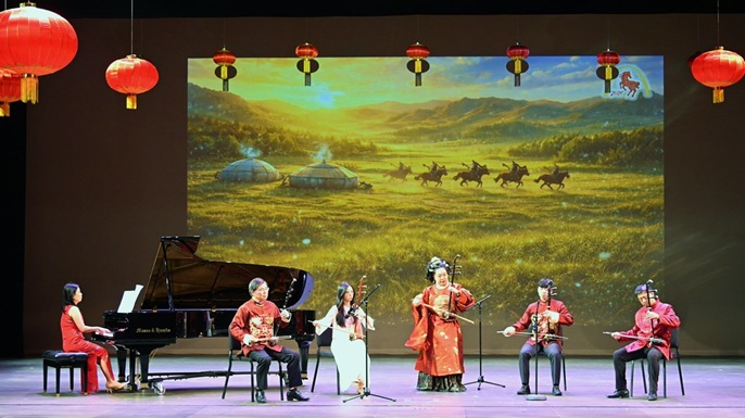 二胡齐奏《新赛马》在二胡演奏家张如琳领衔、沈文钢琴伴奏下气势磅礴。通过拨弦、抛弓等技巧生动再现骏马奔腾的壮阔场面。马年新赛马旋律激昂澎湃,扣人心弦,赢得观众热烈掌声。