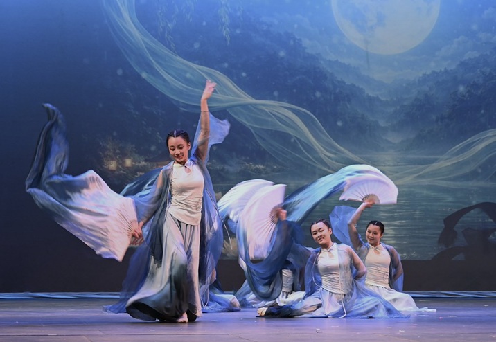 随后,华大LNYF中国扇舞团带来的《午夜雨》以柔美典雅的舞姿呈现东方意境。舞者手中丝扇如水流般轻盈舒展,动作细腻流畅,仿佛月夜细雨轻落人间,营造出梦幻而诗意的舞台画面,观众沉浸其中,如梦如幻。