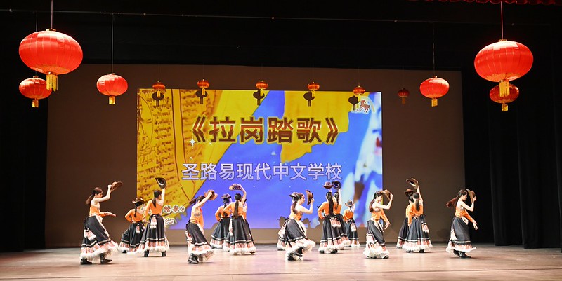 现代中文学校呈现的藏族舞蹈《拉岗踏歌》气势恢宏。舞者以厚重有力的步伐与开阔大气的队形,展现雪域高原人民与天地共舞、与自然同歌的精神风貌。舞蹈节奏由缓至强层层推进,气势恢宏而情感细腻,生动诠释藏族舞蹈独有的力量与虔诚之美。鲜明的色彩与欢快的旋律节奏让观众仿佛置身壮美的异域高原。