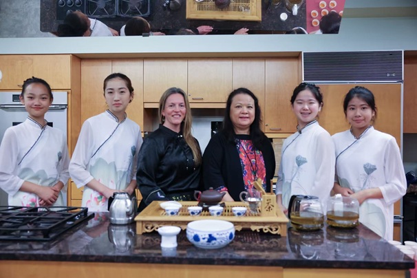 而撑起这个项目的灵魂人物,非张丹缨老师莫属。2015年她专程回国参加暨南大学旅游学院举办的茶艺培训班,回来后创办了高效的茶艺教学体系。十余年来,她培养了近五十名学生参加茶艺表演。这些孩子大多是她中文课上七八岁的小不点儿,一晃眼长成窈窕淑女,便在茶香中登台亮相。演出前,她们还要先“客串”礼仪小姐,成了植物园里最美的一道风景。
